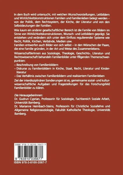 Familienbilder als Forschungsthema.- Die theologische Perspektive.- Ehe und Familie im Zeichen der befreienden Liebe Jesu Christi. Theologische Familienleitbilder und ihre ethischen Implikationen.- "Heilige Familie" - Religions- und Sozialbild ultramontanen Lebens.- Vom Leben für andere: Frauenfragen als Beziehungsfragen? Überlegungen aus der Perspektive theologischer Ethik.- Die literaturwissenschaftliche Perspektive.- Familie im Kinderschauspiel des ausgehenden 18. und frühen 19. Jahrhunderts: Christian Felix Weiße, August Rode und Chr. Ernst von Houwald.- Zurück zu den Müttern? Zu den kulturtheoretischen und literarischen Diskussionen über Familie Anfang des 20. Jahrhunderts.- Familiale Autorität im literarischen Diskurs. Anfragen an phantastische Kinderliteratur. Die Kindermärchen E.T.A. Hoffmanns (1816/17) und zwei phantastische Romane Cornelia Funkes (1997/2000).- Die soziologische Perspektive.- Von Patriarchen und anderen Vätern. Männer in Familien nach Trennung und Scheidung.- Fotos ohne Namen, Geschichte ohne Ort. Fragmentarische Tradierung und "Erinnerungsarbeit" in Familien ehemaliger jüdischer Displaced Persons.- Die rechtswissenschaftliche Perspektive.- Rechtsprechung als Interpretation der Wirklichkeit. Methodische Aspekte der Rechtsgewinnung im Familienrecht.- Familienbilder in afrikanischen Familienrechten. Vergleichende Überlegungen innerhalb eines pluralistischen Rechtssystems.- Familienbilder im deutschen Sozialversicherungsrecht. Eine Skizze.- Auswertung.- Familienbilder. Erträge und Desiderate einer interdisziplinären Verständigung.- Dank.- Autorinnen und Autoren.