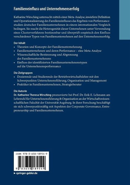 Katharine Wirsching untersucht mittels einer Meta-Analyse, inwiefern Definition und Operationalisierung des Familieneinflusses das Ergebnis von Performancestudien deutscher Familienunternehmen in einem internationalen Vergleich bedingen. Sie macht die Heterogenität dieser Unternehmen unter Verwendung eines Clusterverfahrens bestimmbar und überprüft empirisch den Einfluss verschiedener Typen von Familienunternehmen auf den Unternehmenserfolg.