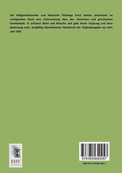 Der Religionshistoriker und klassische Philologe Ernst Samter präsentiert im vorliegenden Band eine Untersuchung über den römischen und griechischen Familienkult. Er erläutert Riten und Bräuche und geht ihrem Ursprung und ihrer Bedeutung nach. Sorgfältig überarbeiteter Nachdruck der Originalausgabe aus dem Jahr 1901.
