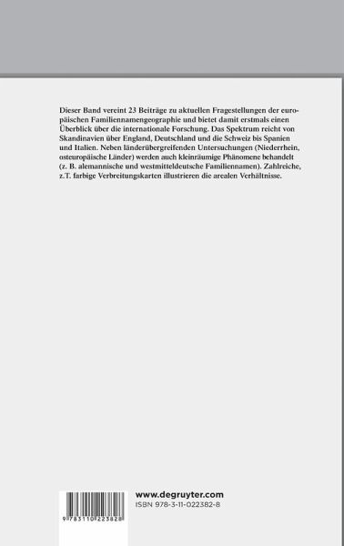 This volume contains 27 current research articles related to the geography of family names in Europe, providing for the first time an overview of international research in this field. The spectrum includes studies (Scandinavia), studies of specific countries (e.g. Austria, Germany, the Netherlands, England, Poland, Spain, Portugal), and phenomena in small geographic areas (e.g. Alemannic, West Central German). Numerous distribution maps document the areal relationships.