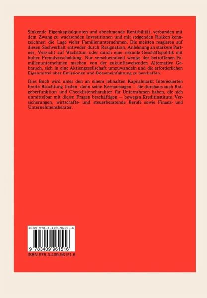 1 Familienunternehmen als Marktpotential für Börsenneueinführungen.- I. Die Börseneinführung aus der Sicht der Familienuntemehmen.- II. Die Börseneinführungen der letzten zwei Jahrzehnte.- III. Börsenreife Familienunternehmen.- 2 Das börsennotierte Familienunternehmen - ein Widerspruch?.- I. Personale Beziehungen der Anteilseigner zum Unternehmen.- II. Überkritische Tendenzen in der öffentlichen Meinung verleiden den Familienunternehmen die Börseneinführung.- III. Auflösung des scheinbaren Widerspruchs.- IV. Notwendig sind: mehr Mut der Familienunternehmen bei der Durchsetzung ihrer Interessen und eine positivere Einstellung zu ihnen.- 3 Familienbeherrschung und Anlegerinteressen.- I. Die Lage der Publikumsgesellschaften in Deutschland.- II. Der Anleger in der beherrschten Gesellschaft.- III. Familienbeherrschte Publikumsgesellschaften.- 4 Das börsennotierte Familienunternehmen in volkswirtschaftlicher Sicht.- I. Familienunternehmen - Beute oder Hindernis der Konzentrationstendenzen?.- II. Börseneinführung = Wachstumsfinanzierung + Selbständigkeit.- III. Die Schutzfunktion der Familie.- 5 Vorteile der Börseneinführung für das Unternehmen und für die Familie.- I. Welche Vorteile bringt die Börseneinführung - und für wen?.- II. Börseneinführungsberatung.- III. Ergebnisvorteil für Unternehmen und Familie.- IV. Vorteile der Börseneinführung aus der Sicht des Familienunternehmens.- V. Vorteile der Börseneinführung für die Familie.- 6 Wirkliche und scheinbare Nachteile der Börseneinführung für die Familie.- I. Verringerter Einfluß der Anteilseigner auf die Geschäftsführung.- II. Gefahr der Überfremdung.- III. Mitbestimmung der Arbeitnehmer.- IV. Publizität.- V. Finanz- und Verwaltungsaufwand.- VI. Höhere Steuerbelastung.- VII.Ergebnis: Ob Vor- oder Nachteile überwiegen, hängt vom Einzelfall ab. Kriterien hierfür.- 7 Das aktienrechtliche Instrumentarium zur Wahrung des Familieneinflusses und seine Handhabung.- I. Verfassung der Aktiengesellschaft.- II. Die erforderlichen Mehrheiten in der Hauptversammlung - und wie man sie behält.- III. Einfluß der Familie im Aufsichtsrat.- IV. Einfluß auf die Unternehmenspolitik des Vorstandes.- V. Familieneinfluß durch Beherrschungsvertrag.- 8 Die Organisation des Familieneinflusses auf eine börsennotierte Aktiengesellschaft.- I. Regelungsbedürftige Fragen zur Wahrung des Familieneinflusses.- II. Organisationsformen.- III. Familien-Holding.- IV. Ohne Holding geht es nicht.- 9 Finanzierungsstrategien expansionsstarker börsennotierter Familien-Aktiengesellschaften.- I. Eigenkapitalbedarf und -beschaffung.- II. Instrumente einer Finanzierungsstrategie.- III. Mehrstufige Finanzierungsstrategien.- IV. Entwicklung eines konzernstrategischen Bewußtseins.- 10 Voraussetzungen und Durchführung einer Börseneinführung.- I. Ein "Markt" für emittierte Aktien: Warum man ihn braucht und wie man ihn schafft.- II. Voraussetzungen für die Börsenzulassung.- III. Zulassungsverfahren.- IV. Kosten der Börseneinführung und laufende Kosten.- V. Vorbereitung der Börseneinführung durch kapitalmarktreife Familienunternehmen.- 11 Eigenkapitalversorgung für junge expandierende Unternehmen.- I. Zur Situation junger expandierender Unternehmen.- II. "Kapitalmarktreife" Aktiengesellschaften - ein Widerspruch in sich.- III. Der geregelte Freiverkehr.- IV. Der Telefonverkehr mit und ohne Preisfeststellung.- V. Lösung für emissionswillige jüngere Unternehmen.