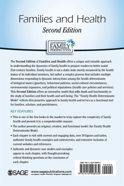 This interdisciplinary text examines five different components of family health--biology, behavior, social-cultural circumstances, the environment, and health care--and the ways they affect the abilities of family members to perform well in their homes, workplaces, and communities. Special awareness is paid to health disparities among individuals, families, groups, regions, and nations. The author discusses how health of individual families influences our local, national, and global communities. Families and Health argues that family health is not a privilege for the few, but a personal, national, and global right and responsibility.