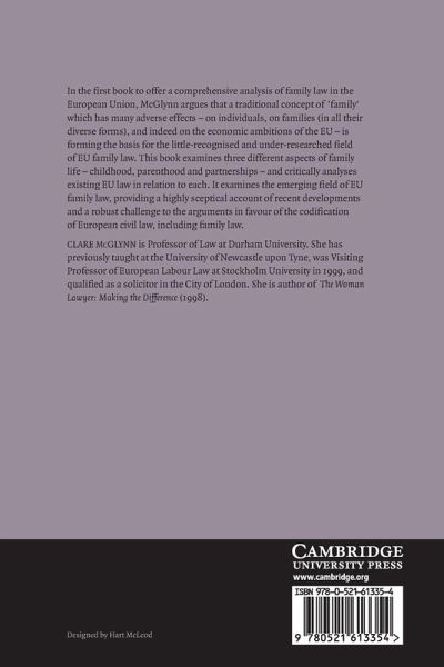 In the first book to offer a comprehensive analysis of family law in the European Union, McGlynn argues that a traditional concept of 'family' which has many adverse effects - on individuals, on families (in all their diverse forms), and indeed on the economic ambitions of the EU is forming the basis for the little-recognised and under-researched field of EU family law. This book examines three different aspects of family life - childhood, parenthood and partnerships - and critically analyses existing EU law in relation to each. It examines the emerging field of EU family law, providing a highly sceptical account of recent developments and a robust challenge to the arguments in favour of the codification of European civil law, including family law.