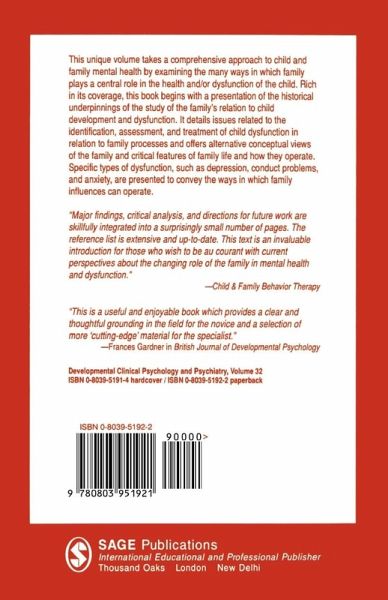 The family plays a central role in the mental health of children. This study of the family in relation to child development and dysfunction explores whether there are critical family characteristics that are reliably predictive of childhood dysfunction - and whether these characteristics can be modified by family therapy. The author places specific types of dysfunction such as depression, conduct problems and anxiety in the context of family influences, and details issues of identification, assessment and treatment of childhood dysfunction in relation to family processes.