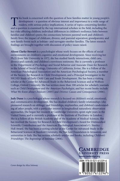 This book is concerned with the question of how families matter in young peoples development - a question of obvious interest and importance which has serious policy implication. A series of key current topics concerning families are examined by the top international scholars in the field, including the key risks affecting children, individual differences in their resilience, links between families and peers, the connections between parental work and childrens family lives, the impact of childcare, divorce, and parental separation, grandparents, and new family forms such as lesbian and surrogate mother families.