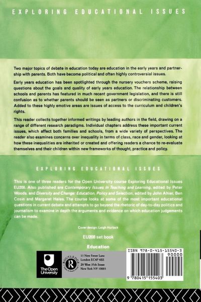 This book completes the series of readers for the Open University's undergraduate course EU208 Exploring Educational Issues. It brings together informed writings from a variety of research paradigms. One of the major themes of the book is the current controversy over early years education. It explores the nursery voucher scheme, the relationship between school and parents, the goals of education, and how quality can be controlled. The book also examines issues of inequality in terms of class, race and gender, and offers readers a chance to re-evaluate themselves and their children within new frameworks of thought, practice and policy.