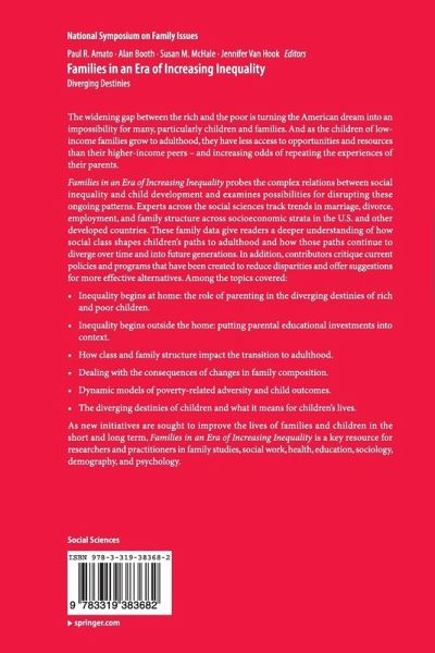 Inequality begins at home: the role of parenting in the diverging destinies of rich and poor children.Inequality begins outside the home: putting parental educational investments into context.How class and family structure impact the transition to adulthood.Dealing with the consequences of changes in family composition.Dynamic models of poverty-related adversity and child outcomes.The diverging destinies of children and what it means for children's lives. As new initiatives are sought to improve the lives of families and children in the short and long term, Families in an Era of Increasing Inequality is a key resource for researchers and practitioners in family studies, social work, health, education, sociology, demography, and psychology.