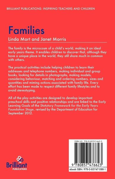 The family is the microcosm of a child's world, making it an ideal early years theme. It enables children to discover that, although they have a unique place in the world, they still share much in common with others. The practical activities include helping children to learn their addresses and telephone numbers, making individual and group books, looking for details in photographs, making models, considering behaviour, matching and ordering numbers, sizes and quantities and miming actions associated with family life. Every effort has been made to respect different family lifestyles and to avoid stereotyping. All of the play activities are designed to develop important preschool skills and positive relationships and are linked to the Early Learning Goals of the Statutory Framework for the Early Years Foundation Stage, revised by the Department of Education for September 2012.