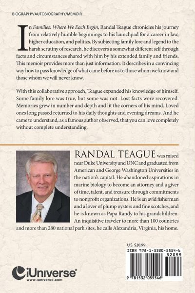 In Families: Where We Each Begin,,/i> Randal Teague chronicles his journey from relatively humble beginnings to his launchpad for a career in law, higher education, and politics. By subjecting family lore and legend to the harsh scrutiny of research, he discovers a somewhat different self through facts and circumstances shared with him by his extended family and friends. This memoir provides more than just information. It describes in a convincing way how to pass knowledge of what came before us to those whom we know and those whom we will never know. With this collaborative approach, Teague expanded his knowledge of himself. Some family lore was true, but some was not. Lost facts were recovered. Memories grew in number and depth and lit the corners of his mind. Loved ones long passed returned to his daily thoughts and evening dreams. And he came to understand, as a famous author observed, that you can love completely without complete understanding .