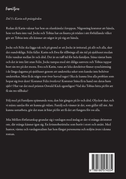 Familjen Del 5 i Karin och prästgården Redan då Karin vaknar har hon en olustkänsla i kroppen. Någonting kommer att hända, hon vet bara inte vad. Jocke och Tobias har en fnurra på tråden i sitt förhållande vilket gör att Tobias inte alls känner att något är på väg att hända. Jocke och Felix ska lägga tak och på grund av att Jocke är irriterad, på allt och alla, sker det oundvikliga. Felix faller. Karin och Ewa får tillbringa all sin tid på sjukhuset medan Felix vandrar mellan liv och död. Det är en tuff tid för hela familjen. Stina väntar barn och det är inte lätt utan Felix. Jocke tampas med sitt dåliga samvete och Tobias tappar bort sin tro på det mesta. Ewa och Karin, vana att leka detektiver finner sysselsättning i de långa dagarna på sjukhuset genom att undersöka saker som kanske inte behöver undersökas. Men få de några svar över huvud taget? Ska de kunna lösa alla problem som hopar sig över dem? Kommer Felix överleva? Kommer Stina få ta hand om deras barn själv? Hur var det med prästen Oswald Käck egentligen? Vad ska Tobias hitta på för att få sin tro tillbaka? Följ med på Familjens spännande resa, den här gången på liv och död. Olyckor sker, och vi måste samlas för att kunna gå vidare. Familj och vänner är det, som gäller till sist. Att kunna samarbeta, gör det man är bäst på för att få det att fungera för oss alla.