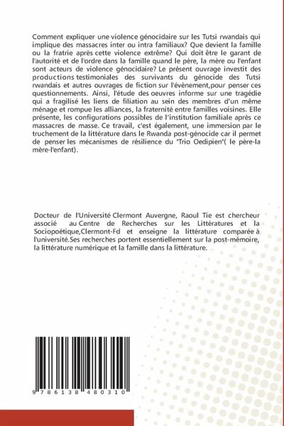 Comment expliquer une violence génocidaire sur les Tutsi rwandais qui implique des massacres inter ou intra familiaux? Que devient la famille ou la fratrie après cette violence extrême? Qui doit être le garant de l'autorité et de l'ordre dans la famille quand le père, la mère ou l'enfant sont acteurs de violence génocidaire? Le présent ouvrage investit des productions testimoniales des survivants du génocide des Tutsi rwandais et autres ouvrages de fiction sur l'évènement,pour penser ces questionnements. Ainsi, l'étude des oeuvres informe sur une tragédie qui a fragilisé les liens de filiation au sein des membres d'un même ménage et rompue les alliances, la fraternité entre familles voisines. Elle présente, les configurations possibles de l'institution familiale après ce massacres de masse. Ce travail, c'est également, une immersion par le truchement de la littérature dans le Rwanda post-génocide car il permet de penser les mécanismes de résilience du "Trio Oedipien"( le père-la mère-l'enfant).