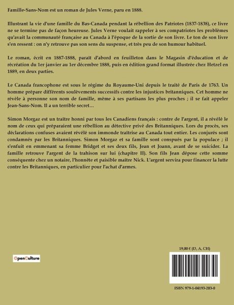 "Famille sans nom" de Jules Verne est un roman historique qui se déroule au Canada au XIXe siècle, durant la rébellion des Patriotes de 1837-1838. L'uvre est divisée en deux parties, chacune explorant les luttes et les aspirations des personnages principaux, Jean et Joann, membres d'une famille dont le nom est synonyme de résistance. La première partie s'ouvre sur un contexte historique détaillé, introduisant les tensions entre les colons français et le gouvernement britannique. Les protagonistes, Jean et Joann, sont les fils de Simon Morgaz, un homme injustement accusé de trahison. Ils vivent sous une identité cachée, cherchant à laver l'honneur de leur famille tout en participant activement à la rébellion. À travers des péripéties allant de Québec à Montréal, les frères s'engagent dans des actions clandestines, rencontrent des alliés et affrontent des ennemis, tout en naviguant dans un paysage politique complexe. La deuxième partie du roman intensifie le récit avec des batailles décisives, des trahisons et des sacrifices personnels. Les frères Morgaz, en quête de justice et de liberté, sont confrontés à des dilemmes moraux et à des choix cruciaux qui détermineront le sort de leur famille et de leur cause. Le roman se termine sur une note poignante, soulignant les conséquences de l'insurrection et la quête inachevée de reconnaissance et de liberté. Verne, à travers une narration fluide et détaillée, offre une réflexion sur l'identité, l'honneur et la lutte pour la justice.