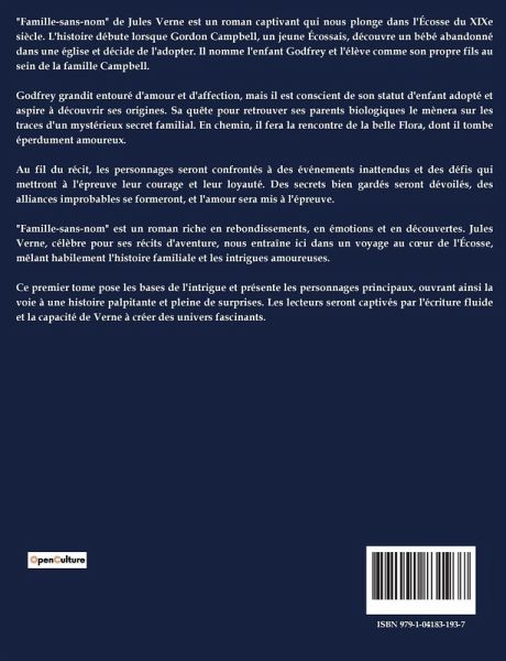 "Famille sans nom" de Jules Verne est un roman historique qui se déroule au Québec au XIXe siècle, durant la période des rébellions de 1837-1838 contre le régime colonial britannique. L'histoire suit les aventures de Jean et Joann, deux frères qui luttent pour la liberté et l'identité de leur peuple. Le récit commence par une série de faits et de dates qui plantent le décor historique, puis nous plonge dans la vie des protagonistes douze ans avant les événements principaux. Jean, sous l'identité de Martin, et Joann, se battent pour la cause des Patriotes, un groupe de rebelles cherchant à libérer le Canada de l'emprise britannique. Le roman est divisé en deux parties. La première partie introduit les personnages et les enjeux politiques, avec des chapitres tels que "Quelques faits, quelques dates", "Un notaire huron", et "La villa Montcalm". La deuxième partie se concentre sur les actions militaires et les conséquences de la rébellion, avec des chapitres comme "Premières escarmouches", "Saint-Denis et Saint-Charles", et "Dernières phases de l'insurrection". À travers des évolutions narratives, Verne explore les thèmes de l'identité, de la résistance et du sacrifice. Les frères doivent naviguer entre loyauté familiale et devoir patriotique, tout en affrontant des dilemmes moraux et des trahisons. Le roman se termine sur une note tragique mais héroïque, soulignant la complexité de la lutte pour la liberté.