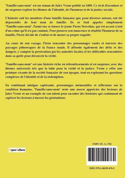 "Famille-sans-nom" est un roman de Jules Verne publié en 1889. Ce récit d'aventure et de suspense explore les thèmes de l'identité, de l'honneur et de la justice sociale. L'histoire suit les membres d'une famille française qui, pour diverses raisons, ont été dépossédés de leur nom de famille. Ils se font appeler simplement "Famille-sans-nom". Parmi eux se trouve le jeune Pierre Servettaz, qui est accusé à tort d'un crime qu'il n'a pas commis. Pour prouver son innocence et rétablir l'honneur de sa famille, Pierre décide de s'enfuir et de mener sa propre enquête. Au cours de son voyage, Pierre rencontre des personnages variés et traverse des paysages pittoresques de la France rurale. Il affronte également des défis et des dangers, y compris la persécution par les autorités locales et les difficultés rencontrées dans sa quête pour découvrir la vérité. "Famille-sans-nom" est une histoire riche en rebondissements et en suspense, avec des thèmes universels tels que la lutte pour la vérité et la justice. Verne y offre une peinture vivante de la société française de son époque, tout en explorant les questions complexes de l'identité et de la rédemption. En combinant intrigue captivante, personnages mémorables et réflexions sur la condition humaine, "Famille-sans-nom" reste une ¿uvre appréciée des lecteurs de Jules Verne et un exemple de son talent pour raconter des histoires qui continuent de captiver les lecteurs à travers les générations.