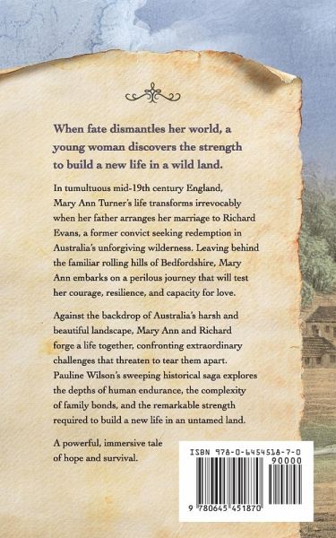 When fate dismantles her world, a young woman discovers the strength to build a new life in a wild land. In tumultuous mid-19th century England, Mary Ann Turner's life transforms irrevocably when her father arranges her marriage to Richard Evans, a former convict seeking redemption in Australia's unforgiving wilderness. Leaving behind the familiar rolling hills of Bedfordshire, Mary Ann embarks on a perilous journey to the Castlemaine gold fields, that will test her courage, resilience, and capacity for love. Against the backdrop of Australia's harsh and beautiful landscape, Mary Ann and Richard forge a life together, confronting extraordinary challenges that threaten to tear them apart. Pauline Wilson's sweeping historical saga explores the depths of human endurance, the complexity of family bonds, and the remarkable strength required to build a new life in an untamed land. A powerful, immersive tale of hope and survival.