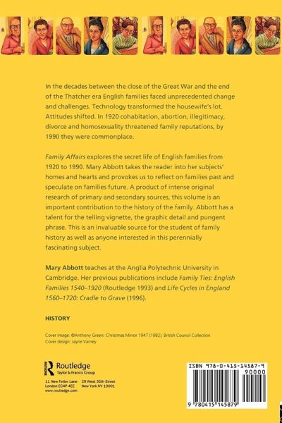 The decades between the close of World War I and the end of the Thatcher era have changed and challenged family life in England dramatically. The Depression and World War II shifted priorities and behaviour, as did the Welfare State, the Pill and Women's Lib later on. What threatened a family's respectability in the 1920s is often commonplace today - abortion, contraception, the single parent family, or gay relationships. Family Affairs explores the secret life of English families from 1920 to 1990. Mary Abbott takes the reader into her subjects' homes and hearts and provokes readers to reflect on families past and speculate on families future. A product of intense original research of primary and secondary sources, this volume is a useful contribution to the history of the family.