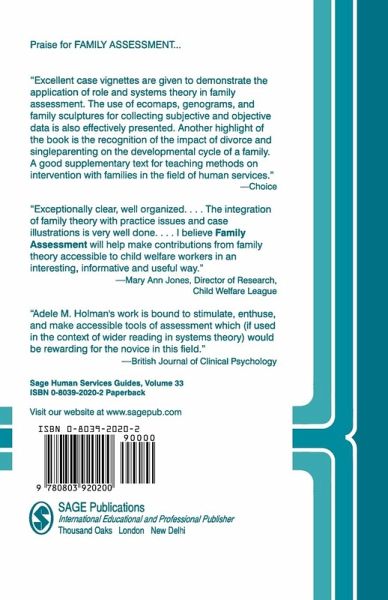 A practical guide for human service workers and students which describes and shows techniques for use in assessing families. The author reviews a conceptual basis of family assessment in chapters that focus on the family as a system, the family and its environment, and the family life cycle. She goes on to describe such methods of assessment as the ecomap, the genogram, family sculpture, and the use of observation and checklists. Throughout the guide, case examples are used to illustrate concepts and show the techniques in use. A special feature of particular value is the self-teaching exercises designed to give the reader practice in applying these ideas and methods. A concluding chapter relates family assessment to treatment or intervention.