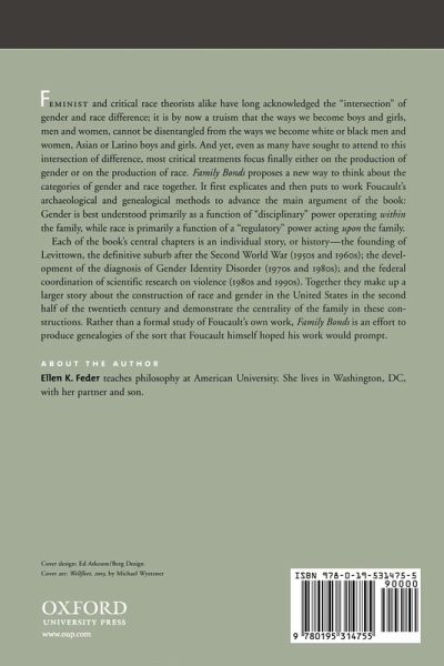 Ellen Feder's monograph is an attempt to think about the categories of race and gender together. She explains and then employs some critical tools derived from Foucault (particularly his ideas about systems of knowledge and the power that governs them), in order to advance her main argument: that the institution of the family is the locus of the production of gender and race, and that gender is best understood as a function of a "disciplinary" power that operateswithin the family, while race is the function of a "regulatory" power acting upon the family from outside. Her interdisciplinary work will be of interest to feminist philosophers and theorists because it plays into a recent expansion of interest in the family, as well as to literary scholars ofFoucault, to scholars of race and race theory, and to other feminist scholars in political science, sociology, anthropology, and cultural studies.