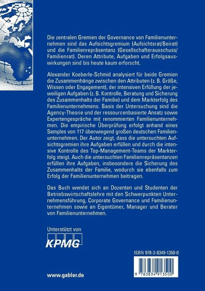 Alexander Koeberle-Schmid analysiert für beide Gremien die Zusammenhänge zwischen den Attributen (z. B. Größe, Wissen oder Engagement), der intensiven Erfüllung der jeweiligen Aufgaben (z. B. Kontrolle, Beratung und Sicherung des Zusammenhalts der Familie) und dem Markterfolg des Familienunternehmens. Basis der Untersuchung sind die Agency-Theorie und der ressourcenbasierte Ansatz sowie Expertengespräche mit renommierten Familienunternehmen. Die empirische Überprüfung erfolgt anhand eines Samples von 117 überwiegend großen deutschen Familienunternehmen. Der Autor zeigt, dass die untersuchten Aufsichtsgremien ihre Aufgaben wie Kontrolle und Beratung erfüllen und durch die intensive Kontrolle des Top-Management-Teams der Markterfolg steigt. Auch die untersuchten Familienrepräsentanzen erfüllen ihre Aufgaben, insbesondere die Sicherung des Zusammenhalts der Familie, wodurch sie ebenfalls zum Erfolg der Familienunternehmen beitragen.