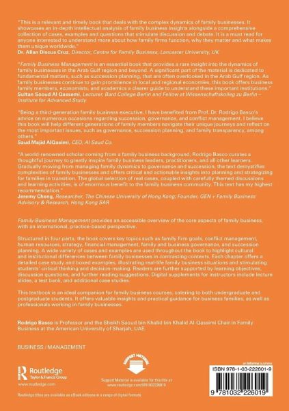 "Family Business Management is an essential book that provides a rare insight into the dynamics of family businesses in the Arab Gulf region and beyond. A significant part of the material is dedicated to fundamental matters, such as succession planning, that are often overlooked in the Arab Gulf region. As family businesses continue to gain prominence in local and regional economies, this book offers business family members, economists, and academics a clearer guide to understand these important institutions."