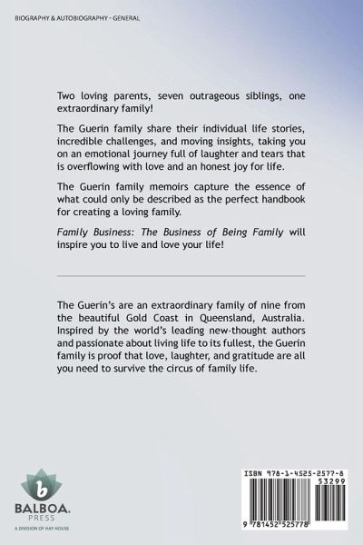 Two loving parents, seven outrageous siblings, one extraordinary family! The Guerin family share their individual life stories, incredible challenges, and moving insights, taking you on an emotional journey full of laughter and tears that is overflowing with love and an honest joy for life. The Guerin family memoirs capture the essence of what could only be described as the perfect handbook for creating a loving family. Family Business: The Business of Being Family will inspire you to live and love your life!