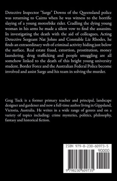 Detective Inspector "Sarge" Downs of the Queensland police was returning to Cairns when he was witness to the horrific slaying of a young motorbike rider. Cradling the dying young woman in his arms he made a silent vow to find the assassins. In investigating the death with the aid of colleagues, Acting Detective Sergeant Nat Johns and Constable Liz Rhodes, he finds an extraordinary web of criminal activity hiding just below the surface. Real estate fraud, extortion, prostitution, money laundering, drug trafficking and people smuggling are all somehow linked to the death of this bright young university student. Border Force and the Australian Federal Police become involved and assist Sarge and his team in solving the murder.