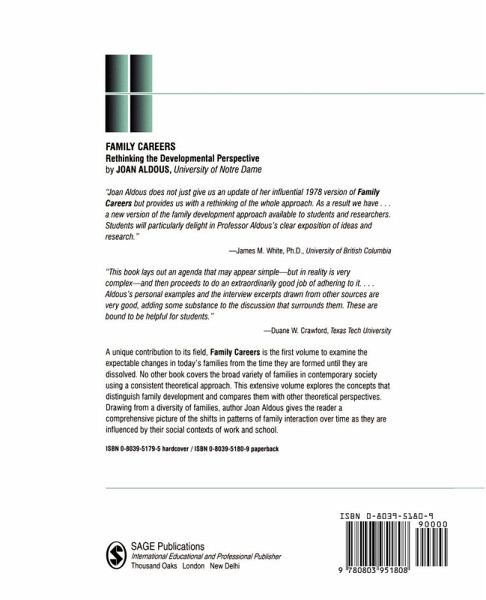 Family Careers makes use of the developmental approach to studying families in order to present a clear, up-to-date account of the changes in families from the time they are formed until they are dissolved. Particular emphasis is given to: the influence of social contexts on patterns of family interaction over time; and the family as a social context within which individual members develop. A coherent and manageable presentation of systems theory informs the argument, and the inherent limitations of the developmental perspective are recognized.
