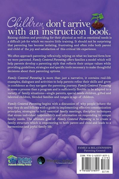 "Family Centered Parenting" does not just offer a set of guidelines, but will give parents the tools necessary to make thoughtful decisions about their parenting options that exist within a consistent system of beliefs. The model teaches parents how to communicate effectively, resolve parenting problems, and implement humane discipline with the goal of empowering both parent and child in order to create a more harmonious and joyful family life.
