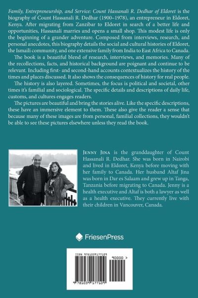 Family, Entrepreneurship, and Service: Count Hassanali R. Dedhar of Eldoret is the biography of Count Hassanali R. Dedhar (1900-1978), an entrepreneur in Eldoret, Kenya. After migrating from Zanzibar to Eldoret in search of a better life and opportunities, Hassanali marries and opens a small shop. This modest life is only the beginning of a grander adventure. Composed from interviews, research, and personal anecdotes, this biography details the social and cultural histories of Eldoret, the Ismaili community, and one extensive family from India to East Africa to Canada. The book is a beautiful blend of research, interviews, and memories. Many of the recollections, facts, and historical background are poignant and continue to be relevant. Including first- and second-hand accounts contextualizes the history of the times and places discussed. It also shows the consequences of history for real people. The history is also layered. Sometimes, the focus is political and societal, other times it's familial and sociological. The specific details and descriptions of daily life, customs, and cultures engages readers. The pictures are beautiful and bring the stories alive. Like the specific descriptions, these have an immersive element to them. These also give the reader a sense that because many of these images are from personal, familial collections, they wouldn't be able to see these pictures elsewhere unless they read the book.