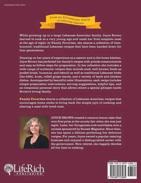 While growing up in a large Lebanese-American family, Joyce Brown learned to cook at a very young age and made her first complete meal at the age of eight. In Family Favorites, she shares a collection of time-honored, traditional Lebanese recipes that have been handed down for four generations. Drawing on her years of experience as a caterer and in the home kitchen, Joyce Brown has perfected her family's recipes with precise measurements and easy-to-follow steps for preparation. In her collection she includes a wide range of authentic recipes that include such well-known foods as pocket bread, hummus, and tabouli as well as traditional Lebanese foods like kibbi, kusa, rolled grape leaves, and a variety of lamb and chicken dishes. Accompanied by beautiful color illustrations, each recipe includes simple preparation instructions, serving suggestions, helpful tips, and an occasional personal story that allows others a special glimpse inside Brown's loving family. Family Favorites shares a collection of Lebanese-American recipes that encourages home cooks to bring back the simple joys of cooking and sharing a meal with loved ones.