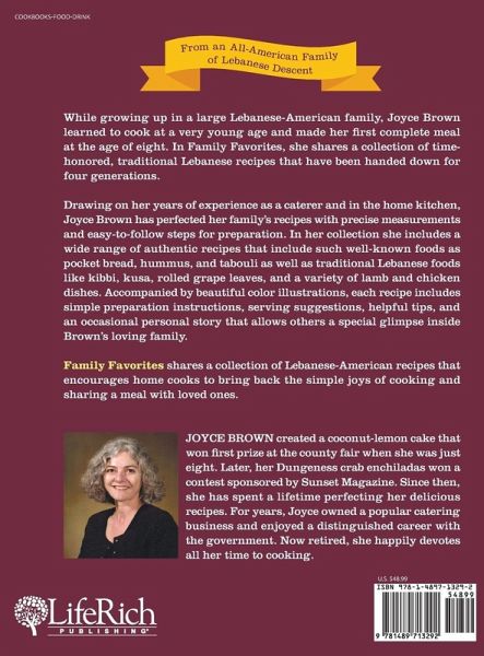 While growing up in a large Lebanese-American family, Joyce Brown learned to cook at a very young age and made her first complete meal at the age of eight. In Family Favorites, she shares a collection of time-honored, traditional Lebanese recipes that have been handed down for four generations. Drawing on her years of experience as a caterer and in the home kitchen, Joyce Brown has perfected her family's recipes with precise measurements and easy-to-follow steps for preparation. In her collection she includes a wide range of authentic recipes that include such well-known foods as pocket bread, hummus, and tabouli as well as traditional Lebanese foods like kibbi, kusa, rolled grape leaves, and a variety of lamb and chicken dishes. Accompanied by beautiful color illustrations, each recipe includes simple preparation instructions, serving suggestions, helpful tips, and an occasional personal story that allows others a special glimpse inside Brown's loving family. Family Favorites shares a collection of Lebanese-American recipes that encourages home cooks to bring back the simple joys of cooking and sharing a meal with loved ones.