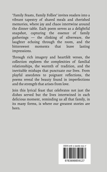 "Family Feasts, Family Follies" invites readers into a vibrant tapestry of shared meals and cherished memories, where joy and chaos intertwine around the dinner table. Each poem serves as a delightful snapshot, capturing the essence of family gatherings - the clinking of silverware, the laughter echoing through the room, and the bittersweet moments that leave lasting impressions. Through rich imagery and heartfelt verses, the collection explores the complexities of familial relationships, the warmth of tradition, and the inevitable mishaps that punctuate our lives. From playful anecdotes to poignant reflections, the poems reveal the beauty found in imperfections and the strength that arises from love. Join this lyrical feast that celebrates not just the dishes served but the lives intertwined in each delicious moment, reminding us all that family, in its many forms, is where our greatest stories are born.