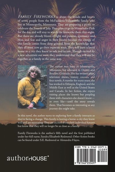 The author was born in Minneapolis, Minnesota but educated in Denver and Boulder, Colorado. She has written plays, television shows, history courses, and four novels. A traveler for many years, she has worked in Ethiopia, England, and the Middle East as well as the United States and Canada. In her fiction, she enjoys visiting places she knows but peopling them with characters she doesnt knowor even likeuntil the story reveals them. That becomes as interesting as any journey she might take. In this novel, the author turns to exploring how a family interacts as theyre facing a change. This family is leaving a home, a city they knew well and are separating. They are excited about their individual futures but know that they will no longer be as close as a family. Family Fireworks is the authors fifth novel and the first published under her full name, Sandra Elizabeth Redmond. Other fiction books can be found under S.E. Redmond or Alexandra Hayes.