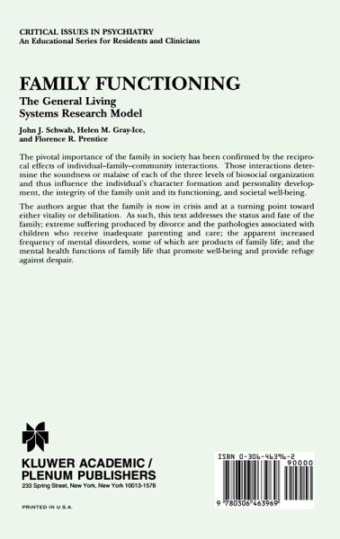 The family, that most fundamentalof human groups, is currently perceived to be changing in response to social, biological, cultural and technological developments in our postmodernsociety. While the observed changes in families have been considered by some sociologists to be evidence of adaptation and, therefore, normal, the authors of this volume, consider them maladaptive. Viewing society from the point of view of clinical psychiatry, they point to greatly increased numbers of children born to single mothers, soaring rates of divorce, a statistically confirmed increase in mental disorders, increase in reported incest, high rates of depression in younger people and escalation of the amount of reported family violence as evidence that the family, as a social institution, is in crisis and can either move toward renewed vitality or continued deterioration. Perceiving a need to obtain information about family functioning that might lead to the increased stability and well-being of this critically important type of system, Dr. John Schwab and his associates designed and camed out a research program that began with a thorough review of relevant literature beginning with LePlay's study of 300 families in the 1850'sand including important recent statistical studies. They found that although these studies represent advances in understanding the family system, some serious problems with the research remain, one of which is confounding variables such as family function and mental or substance abuse disorders so that if a family member has a problem, such as drug abuse, the family is classifiedasdysfunctional.