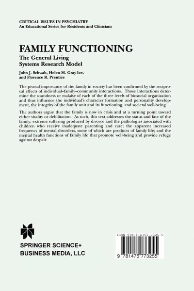 The family, that most fundamentalof human groups, is currently perceived to be changing in response to social, biological, cultural and technological developments in our postmodernsociety. While the observed changes in families have been considered by some sociologists to be evidence of adaptation and, therefore, normal, the authors of this volume, consider them maladaptive. Viewing society from the point of view of clinical psychiatry, they point to greatly increased numbers of children born to single mothers, soaring rates of divorce, a statistically confirmed increase in mental disorders, increase in reported incest, high rates of depression in younger people and escalation of the amount of reported family violence as evidence that the family, as a social institution, is in crisis and can either move toward renewed vitality or continued deterioration. Perceiving a need to obtain information about family functioning that might lead to the increased stability and well-being of this critically important type of system, Dr. John Schwab and his associates designed and camed out a research program that began with a thorough review of relevant literature beginning with LePlay's study of 300 families in the 1850'sand including important recent statistical studies. They found that although these studies represent advances in understanding the family system, some serious problems with the research remain, one of which is confounding variables such as family function and mental or substance abuse disorders so that if a family member has a problem, such as drug abuse, the family is classifiedasdysfunctional.
