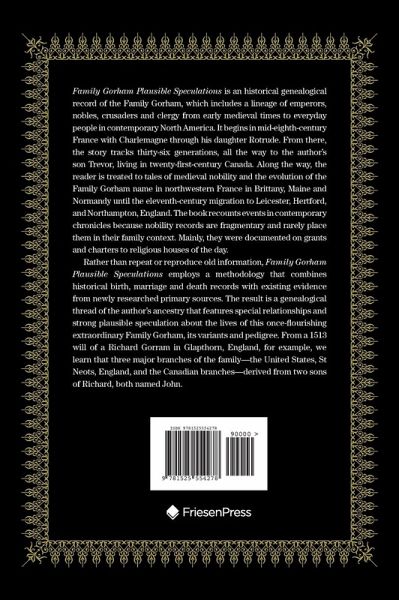 Family Gorham Plausible Speculations is an historical genealogical record of the Family Gorham, which includes a lineage of emperors, nobles, crusaders and clergy from early medieval times to everyday people in contemporary North America. It begins in mid-eighth-century France with Charlemagne through his daughter Rotrude. From there, the story tracks thirty-six generations, all the way to the author's son Trevor, living in twenty-first-century Canada. Along the way, the reader is treated to tales of medieval nobility and the evolution of the Family Gorham name in northwestern France in Brittany, Maine and Normandy until the eleventh-century migration to Leicester, Hertford, and Northampton, England. The book recounts events in contemporary chronicles because nobility records are fragmentary and rarely place them in their family context. Mainly, they were documented on grants and charters to religious houses of the day. Rather than repeat or reproduce old information, Family Gorham Plausible Speculations employs a methodology that combines historical birth, marriage and death records with existing evidence from newly researched primary sources. The result is a genealogical thread of the author's ancestry that features special relationships and strong plausible speculation about the lives of this once-flourishing extraordinary Family Gorham, its variants and pedigree. From a 1513 will of a Richard Gorram in Glapthorn, England, for example, we learn that three major branches of the family-the United States, St Neots, England, and the Canadian branches-derived from two sons of Richard, both named John. "Books about individual family histories can often be sprawling and indigestible for the reader. Thomas William Gorham, author of Family Gorham Plausible Speculations, avoids this trap by presenting the evidence of his ancestral family in a notably concise and clear manner. The work's clarity is aided by an attractive layout incorporating a good range of illustrations. "The book's reach is ambitious, with the chronological coverage stretching from early medieval times to the present, and the locations ranging from continental Europe to England, and then on to North America and Canada. The subtitle 'Plausible Speculations' sounds the key note of caution that must accompany such ambition; and, in a very helpful preface, the author discusses how his interpretations must be qualified by the limitations of the surviving documentary evidence. All too often, enthusiastic family historians don't realise that such caution in historical research is a strength, not a weakness. Wherever possible, original source material has been tracked down; this is discussed and cited in an admirable way, firmly grounding the author's interpretations about his fascinating ancestral story in the records." -Andrew North: Research Assistant, Northamptonshire Archives and Heritage Service, England "I very much like the way the author Thomas William Gorham has put Family Gorham Pausibile Speculations together, and especially like the fact that reference notes are added all the way through so the reader can tell where the evidence could be found- WELL DONE." -Barbara Chapman: Historian, Leverstock Green, Hertfordshire, England. Leverstock Green Chronicle "Family Gorham Plausibile Speculations is beautifully researched, presented and written. Well worth the price. This is a treasure for my granddaughter to cherish as part of her coming to know she is part of a long line of people who made a difference in this world. So grateful Thomas William Gorham." -Ginny Wagner (nee Gorham): CMCA, AMS, Independent Scholar, Texas, USA "My last read Family Gorham Plausible Speculation very enjoyable, well done Thomas William Gorham." -Richard Astle: Cousin, Retired Banker, Museum President, Alberta, Canada "Family Gorham Plausible Explanations has th...