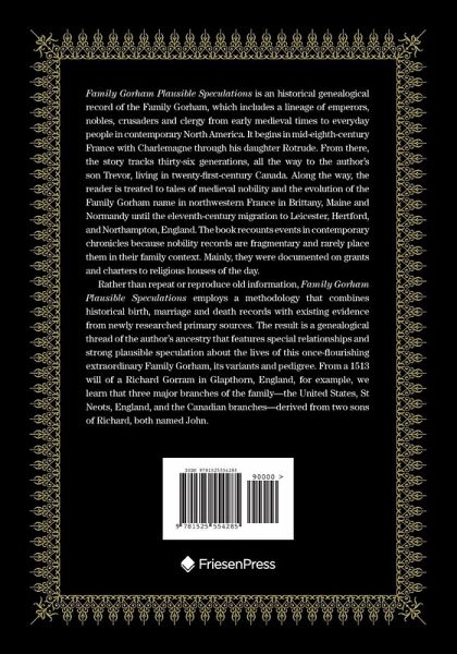 Family Gorham Plausible Speculations is an historical genealogical record of the Family Gorham, which includes a lineage of emperors, nobles, crusaders and clergy from early medieval times to everyday people in contemporary North America. It begins in mid-eighth-century France with Charlemagne through his daughter Rotrude. From there, the story tracks thirty-six generations, all the way to the author's son Trevor, living in twenty-first-century Canada. Along the way, the reader is treated to tales of medieval nobility and the evolution of the Family Gorham name in northwestern France in Brittany, Maine and Normandy until the eleventh-century migration to Leicester, Hertford, and Northampton, England. The book recounts events in contemporary chronicles because nobility records are fragmentary and rarely place them in their family context. Mainly, they were documented on grants and charters to religious houses of the day. Rather than repeat or reproduce old information, Family Gorham Plausible Speculations employs a methodology that combines historical birth, marriage and death records with existing evidence from newly researched primary sources. The result is a genealogical thread of the author's ancestry that features special relationships and strong plausible speculation about the lives of this once-flourishing extraordinary Family Gorham, its variants and pedigree. From a 1513 will of a Richard Gorram in Glapthorn, England, for example, we learn that three major branches of the family-the United States, St Neots, England, and the Canadian branches-derived from two sons of Richard, both named John. "Books about individual family histories can often be sprawling and indigestible for the reader. Thomas William Gorham, author of Family Gorham Plausible Speculations, avoids this trap by presenting the evidence of his ancestral family in a notably concise and clear manner. The work's clarity is aided by an attractive layout incorporating a good range of illustrations. "The book's reach is ambitious, with the chronological coverage stretching from early medieval times to the present, and the locations ranging from continental Europe to England, and then on to North America and Canada. The subtitle 'Plausible Speculations' sounds the key note of caution that must accompany such ambition; and, in a very helpful preface, the author discusses how his interpretations must be qualified by the limitations of the surviving documentary evidence. All too often, enthusiastic family historians don't realise that such caution in historical research is a strength, not a weakness. Wherever possible, original source material has been tracked down; this is discussed and cited in an admirable way, firmly grounding the author's interpretations about his fascinating ancestral story in the records." -Andrew North: Research Assistant, Northamptonshire Archives and Heritage Service, England "I very much like the way the author Thomas William Gorham has put Family Gorham Pausibile Speculations together, and especially like the fact that reference notes are added all the way through so the reader can tell where the evidence could be found- WELL DONE." -Barbara Chapman: Historian, Leverstock Green, Hertfordshire, England. Leverstock Green Chronicle "Family Gorham Plausibile Speculations is beautifully researched, presented and written. Well worth the price. This is a treasure for my granddaughter to cherish as part of her coming to know she is part of a long line of people who made a difference in this world. So grateful Thomas William Gorham." -Ginny Wagner (nee Gorham): CMCA, AMS, Independent Scholar, Texas, USA "My last read Family Gorham Plausible Speculation very enjoyable, well done Thomas William Gorham." -Richard Astle: Cousin, Retired Banker, Museum President, Alberta, Canada "Family Gorham Plausible Explanations has th...