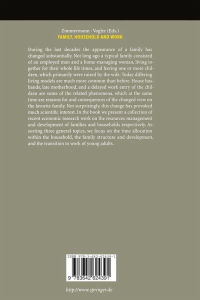During the last decades the appearance of a family has changed substantially. Not long ago a typical family consisted of an employed man and a home-managing woman living together for their whole life times, and having one or more children, which primarily were raised by the wife. Today differing living models are much more common than before. House husbands, late motherhood, and a delayed work entry of the children are some of the related phenomena, which at the same time are reasons for and consequences of the changed view on the favorite family. Not surprisingly, this change has provoked much scientific interest. In this book we present a collection of recent economic research work on the resources management and development of families and households respectively. Assorting three general topics, we focus on the time allocation within the household, the family structure and development, and the transition to work of young adults.