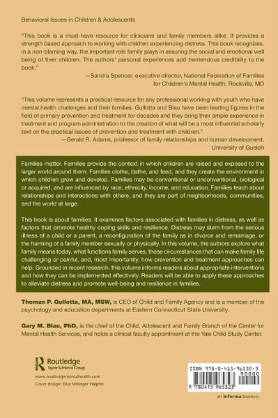 Irrespective of theoretical orientation, families matter. Families are the entity in which children are introduced to words, objects, shapes, and colors. Families are the people related in a myriad of conventional and unconventional ways that clothe, bathe, and feed its biological and acquired offspring. Influenced by race, ethnicity, income, and education, families relate not only to each other within the unit but to others in the neighborhood, the community, and beyond. This book is about families and their children. This book is about those times when the family unit experiences distress. This distress may be found in the serious illness of a child or a parent. It may be the result of a reconfiguration of the family as in divorce and remarriage. Or it may involve the harming of a family member sexually or physically. In this volume, the authors explore what family means today, what functions it serves, and those circumstances that can make family life painful. Importantly, the authors provide readers with clearly written information drawn from the most recent scientific investigations suggesting how the topics in this volume might be addressed to either ease that discomfort (treatment) or prevent its occurrence.
