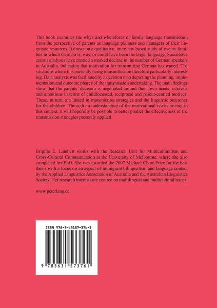 This book examines the whys and wherefores of family language transmission from the perspective of parents as language planners and managers of their linguistic resources. It draws on a qualitative, interview-based study of twenty families in which German is, was, or could have been the target language. Successive census analyses have charted a marked decline in the number of German speakers in Australia, indicating that motivation for transmitting German has waned. The situations where it is presently being transmitted are therefore particularly interesting. Data analysis was facilitated by a decision map depicting the planning, implementation and outcome phases of the transmission undertaking. The main findings show that the parents' decision is negotiated around their own needs, interests and ambitions in terms of child-focussed, reciprocal and parent-centred motives. These, in turn, are linked to transmission strategies and the linguistic outcomes for the children. Through anunderstanding of the motivational issues arising in this context, it will hopefully be possible to better predict the effectiveness of the transmission strategies presently applied.