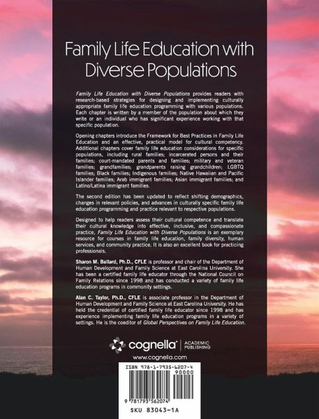Family Life Education with Diverse Populations provides readers with research-based strategies for designing and implementing culturally appropriate family life education programming with various populations. Each chapter is written by a member of the population about which they write or an individual who has significant experience working with that specific population. Opening chapters introduce the Framework for Best Practices in Family Life Education and an effective, practical model for cultural competency. Additional chapters cover family life education considerations for specific populations, including rural families; incarcerated persons and their families; court-mandated parents and families; military and veteran families; grandfamilies; grandparents raising grandchildren; LGBTQ families; Black families; Indigenous families; Native Hawaiian and Pacific Islander families; Arab immigrant families; Asian immigrant families; and Latino/Latina immigrant families. The second edition has been updated to reflect shifting demographics, changes in relevant policies, and advances in culturally specific family life education programming and practice relevant to respective populations. Designed to help readers assess their cultural competence and translate their cultural knowledge into effective, inclusive, and compassionate practice, Family Life Education with Diverse Populations is an exemplary resource for courses in family life education, family diversity, human services, and community practice. It is also an excellent book for practicing professionals.
