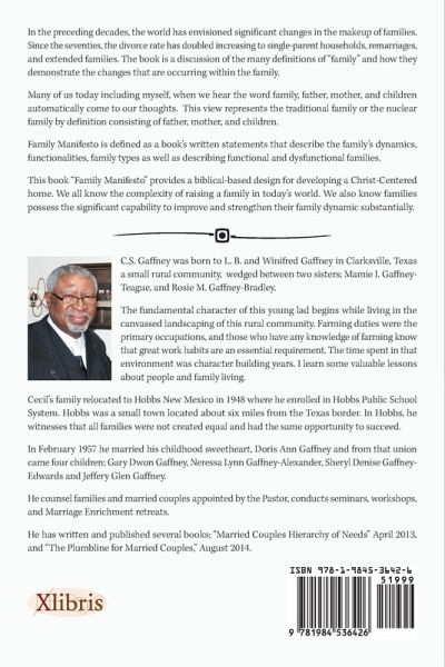 In the preceding decades, the world has envisioned significant changes in the makeup of families. Since the seventies, the divorce rate has doubled increasing to single-parent households, remarriages, and extended families. The book is a discussion of the many definitions of family and how they demonstrate the changes that are occurring within the family. Many of us today including myself, when we hear the word family, father, mother, and children automatically come to our thoughts. This view represents the traditional family or the nuclear family by definition consisting of father, mother, and children. Family Manifesto is defined as a books written statements that describe the familys dynamics, functionalities, family types as well as describing functional and dysfunctional families. This book Family Manifesto provides a biblical-based design for developing a Christ-Centered home. We all know the complexity of raising a family in todays world. We also know families possess the significant capability to improve and strengthen their family dynamic substantially.
