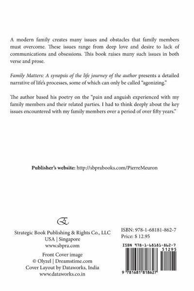 A modern family creates many issues and obstacles that family members must overcome. These issues range from deep love and desire to lack of communications and obsessions. This book raises many such issues in both verse and prose. Family Matters: A synopsis of the life journey of the author presents a detailed narrative of life's processes, some of which can only be called "agonizing." The author based his poetry on the "pain and anguish experienced with my family members and their related parties. I had to think deeply about the key issues encountered with my family members over a period of over fifty years." Publisher's website: http://sbprabooks.com/PierreMeuron