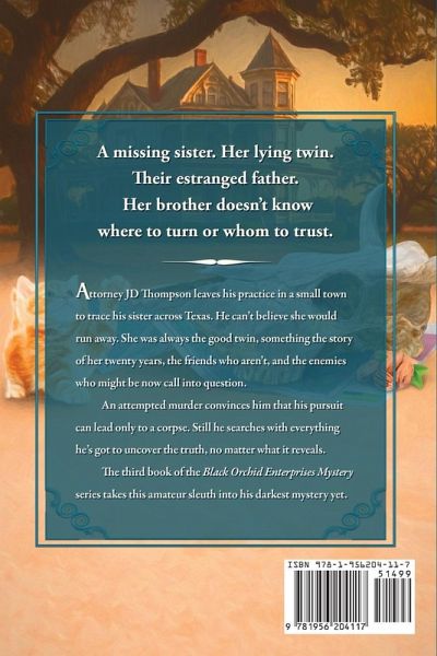 A missing sister. Her lying twin. Their estranged father. Her brother doesn't know where to turn or whom to trust. Attorney JD Thompson leaves his practice in a small town to trace his sister across Texas. He can't believe she would run away. She was always the good twin, something the story of her twenty years, the friends who aren't, and the enemies who might be now call into question. An attempted murder convinces him that his pursuit can lead only to a corpse. Still he searches with everything he's got to uncover the truth, no matter what it reveals. The third book of the Black Orchid Enterprises Mystery series takes this amateur sleuth into his darkest mystery yet.