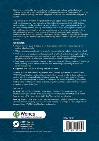 This practical guide is designed specifically to support those planning and conducting family medicine/primary care education within medical schools around the world. It offers medical educators a collection of pithy, easy to follow chapters, guiding the reader through the curriculum requirements with key references for further detail.