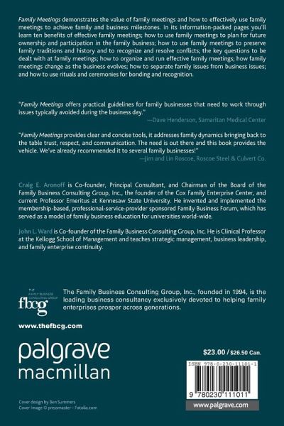 Introduction The Value if Family Meeting Unfounded Fears PART I: TEN BENEFITS OF EFFECTIVE FAMILY MEETINGS Building a Stronger Family Building a Stronger Business Planning for Future Ownership Planning Family Participation Managing Inherited Wealth Opening Up the Succession Process Preserving Family Tradition and History Professionalizing the Business Managing Relations between Family and Board of Directors Recognizing and Resolving Conflict PART II: HOW TO HOLD EFFECTIVE MEETINGS Overcoming Misconceptions and Fears When is the Right Time? Who Should Run the Meeting? The Agenda, Location Whom Do We Invite Openers Icebreakers Documenting the Meeting Closing the Meeting Running Ongoing Meetings Family Retreats Communication Organization How Issues Change as the Business Evolves Forming a Family Council Role and Rituals and Ceremonies Avoiding Pitfalls PART III: SOME MILESTONES REACHED THROUGH FAMILY MEETINGS Planning the Future of the Business Smoothing Ownership Succession Encouraging Family Members in Stewardship Developing Family Skills Creating a Family Mission Statement Summary Index