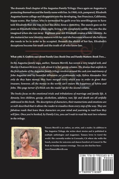 In the Augustus family saga, author, Tamara Merrill, has woven a very tangled web, and Sharon Chatsworth loves to talk about it in her gossip column. The drama that unfolds in the first volume of the Augustus family trilogy revolves around the cash cow matrimony of John Augustus and his beautiful débuante yet problematic wife, Sylvia Alexander. Not only do they have money, they have merged every which way in order to grow their treasure; however, all the money in the world can't ensure the happiness of Sylvia and John. This page turner of a book sets the reader up for the second volume. The books focus on the emotional trials and tribulations of marriage and family life. A dynasty, love children, gossip, alcoholism, adultery, war, life and death are all artfully addressed in this book. The description of characters, their mannerisms and emotions are so well-described that it allows the reader to visualize them every step of the way. They are fabulous reads that leave these characters on your mind and yearning to read how they will fare. In FAMILY MYTHS, the dramatic final chapter of the Augustus Family Trilogy. Once again an Augustus is protecting themselves and the family name with lies. In 1960, rich, pampered, Elizabeth Augustus leaves college and disappears into the developing, San Francisco, California, hippy scene. Her father, who is tormented by guilt over his unwillingness to have told Elizabeth that she was in fact his child, hires a detective. The search goes on for years as Elizabeth hides in plain sight, living a life completely unlike the one the she imagined when she ran away. Eighteen year old Elizabeth creates a fake identity. As she matures her new identity matures with her and she becomes whoever she believes she needs to be in order to be accepted. Beneath the shield of her lies, Elizabeth's deceptions become her truth and the truth of all who know her n