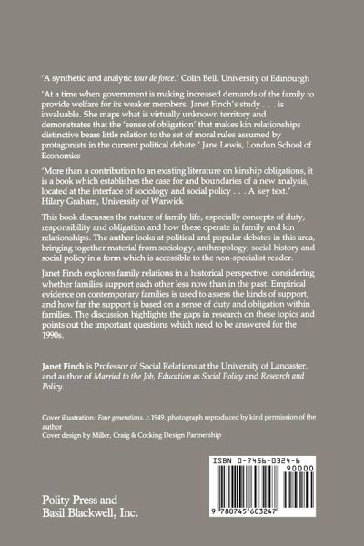 Finch discusses the nature of family life, especially concepts of duty, responsibility and obligation and how these factors operate in family and kin relationships.