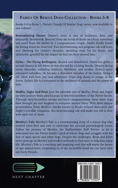 Books 5-8 in Brian L. Porter's 'Family Of Rescue Dogs' series, now available in one volume! Remembering Dexter: Dexter's story is one of resilience, love, and ultimately, heartbreak. Rescued from the brink of death on a busy motorway and saved from the shelter by a compassionate couple, Dexter finally found the loving home he deserved. This heartwarming and poignant tale will leave you cheering for Dexter's victories, shedding tears for his losses, and ultimately, grateful for the impact he had on those around him. Dylan - The Flying Bedlington: Abused and abandoned, Dylan was given a second chance at life when he was rescued by a loving family. Despite facing many obstacles, including deafness, blindness, and strokes, Dylan's spirit remained unbroken. He became a cherished member of the family, living a life filled with love, joy, and adventure. From dog shows to romps in the forest, Dylan's life is a testament to the resilience of animals and the power of love. Muffin, Digby And Petal: Join the adorable trio of Muffin, Petal, and Digby on their journey from playful pups to beloved members of the Porter family. Through their boundless energy and loyal companionship, these three dogs have brought joy and laughter to everyone around them. With their unique personalities, from Muffin's cheeky nature to Petal's refined demeanor and Digby's loveable clinginess, this heartwarming tale will make you fall in love with each one of them. Muttley's Tale: Muttley's Tale is a heartwarming story of a rescue dog who needed extra love and care to overcome his unusual psychological issues. Follow the journey of Muttley, the Staffordshire Bull Terrier, as he is welcomed into the Porter family's pack of rescue dogs and struggles with his fear of open spaces and other dogs. Despite the challenges, Brian and Juliet never gave up on Muttley and worked tirelessly to find ways to help him enjoy life. Muttley's Tale is a touching and inspiring read that will warm the hearts of any animal lover, reminding us of the incredible bond we can form with our furry friends.