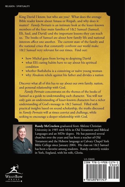 King David I know, but who are you? What does the average Bible reader know about Amasa or Rizpah, and why does it matter? Family Portraits is an intimate look at the lesser-known members of the four main families of 1&2 Samuel (Samuel, Eli, Saul, and David) and the important lessons they can teach us. The books of Samuel are about how family life and national interests affect one another. The current state of the family and the national crises that constantly confront our world make 1&2 Samuel very relevant for our times. Find out: how Michal goes from loving to despising David what Eli's eating habits have to say about his spiritual condition whether Bathsheba is a conniving or naïve young woman why Absalom rebels against his father and divides a nation Discover what all of this has to say about our own family, nation, and personal relationship with God. Family Portraits concentrates on the themes of the books of Samuel as a guide to understanding each character. You will not only gain an understanding of lesser-known characters but a richer understanding of God's message in 1&2 Samuel. Filled with practical insights based on sound scholarship, the truths discussed in Family Portraits will at times convict and challenge, while seeking to encourage a deeper relationship with God.